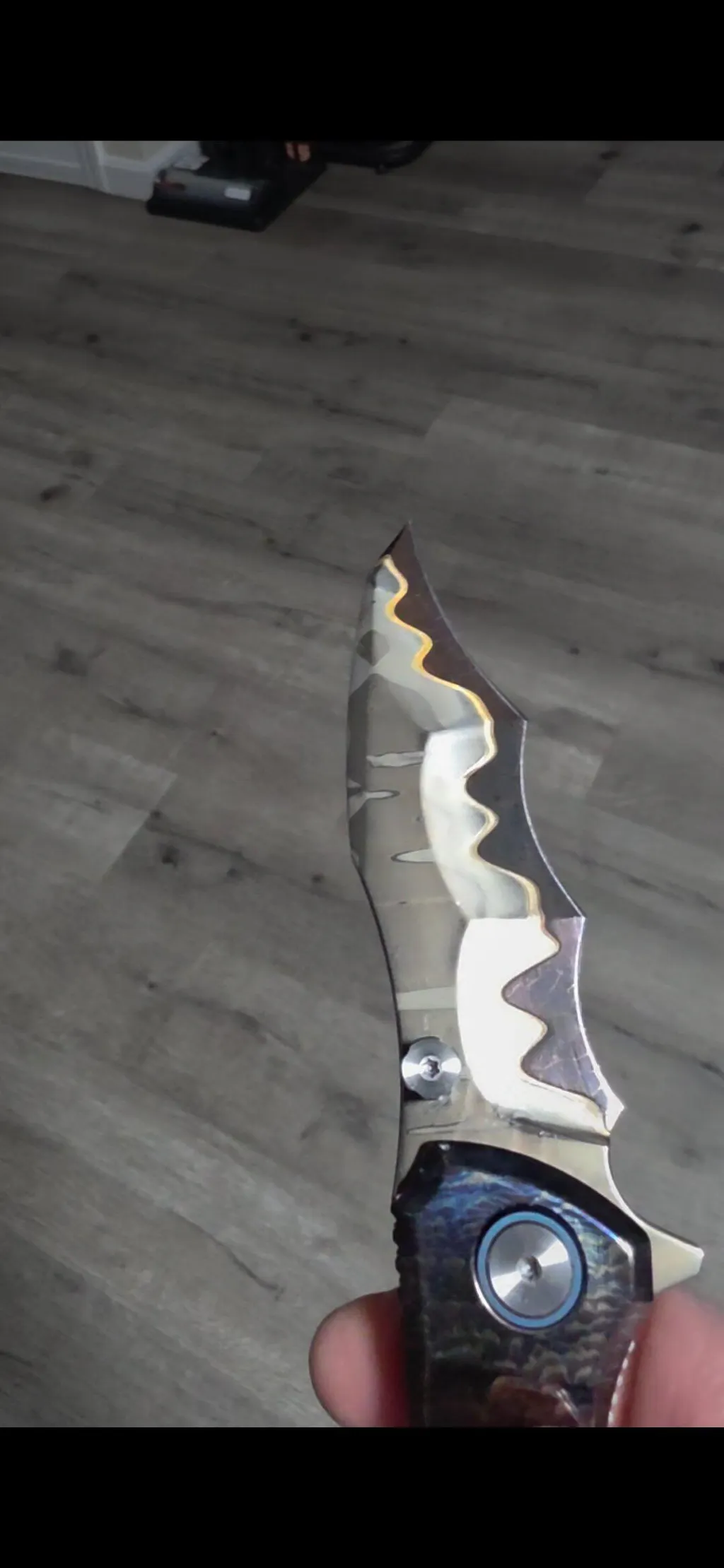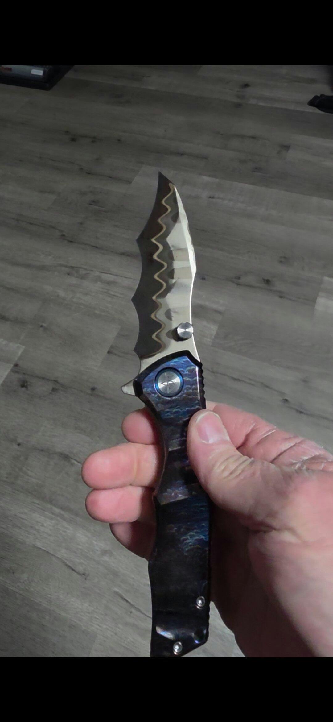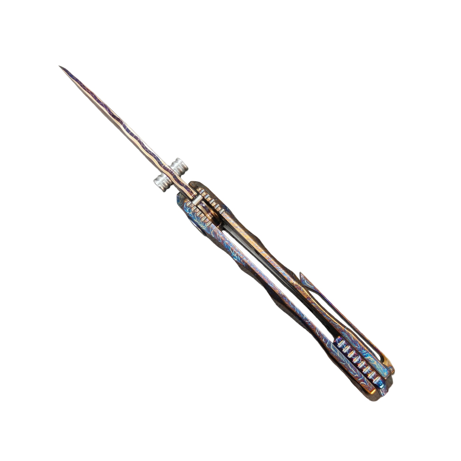 VORIXN "Drakescale" Flipper & Thumb Stud Knife Titanium Hand-Flamed Handle (3.6" Copper San Mai Dragon ScaleDamascus Blade) KB057