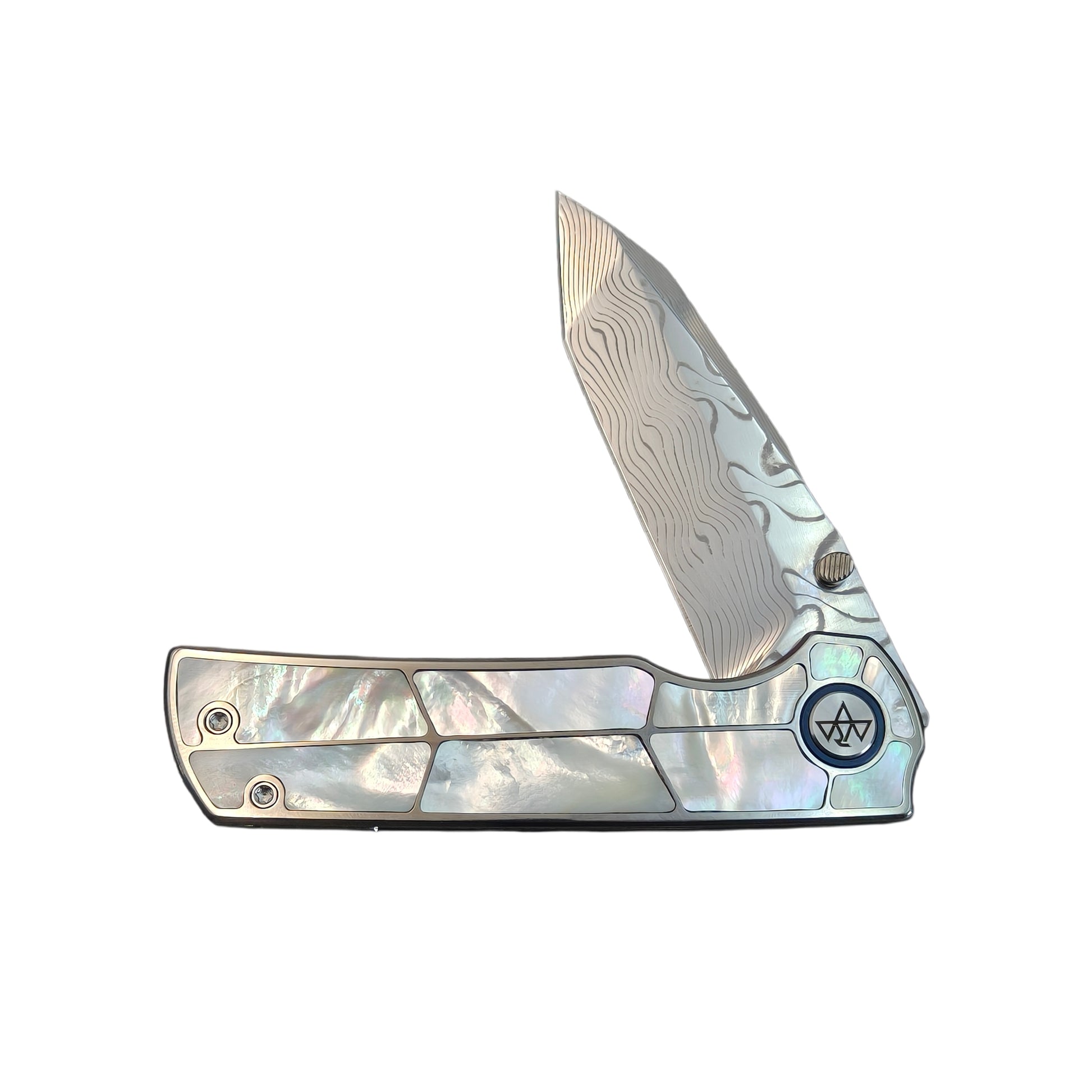 VORIXN "Forest Mirage" Flipper & Thumb Stud Knife White Mother-of-pearl Inlaid Titanium Handle (3.4" Damascus Blade) KB063