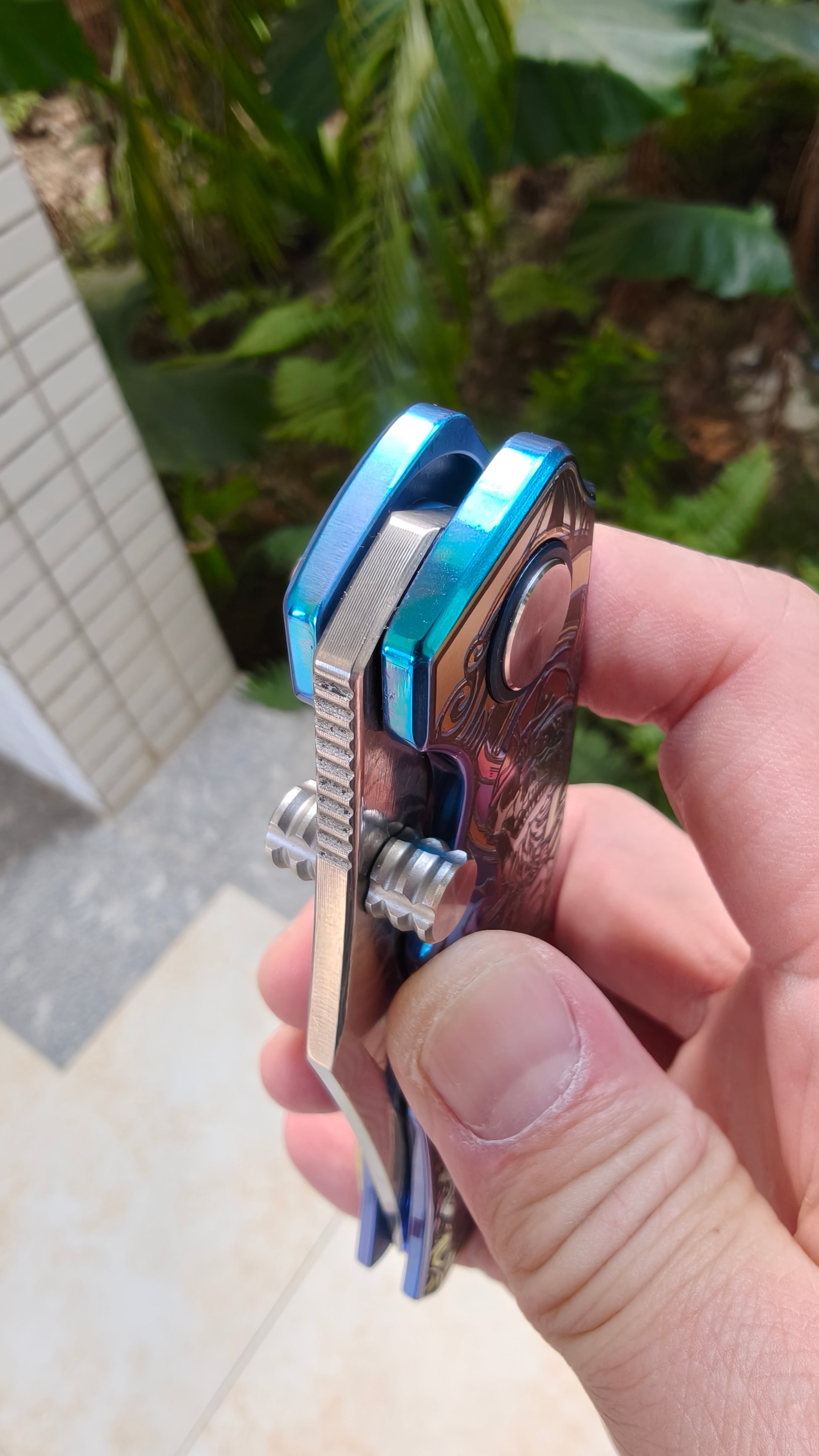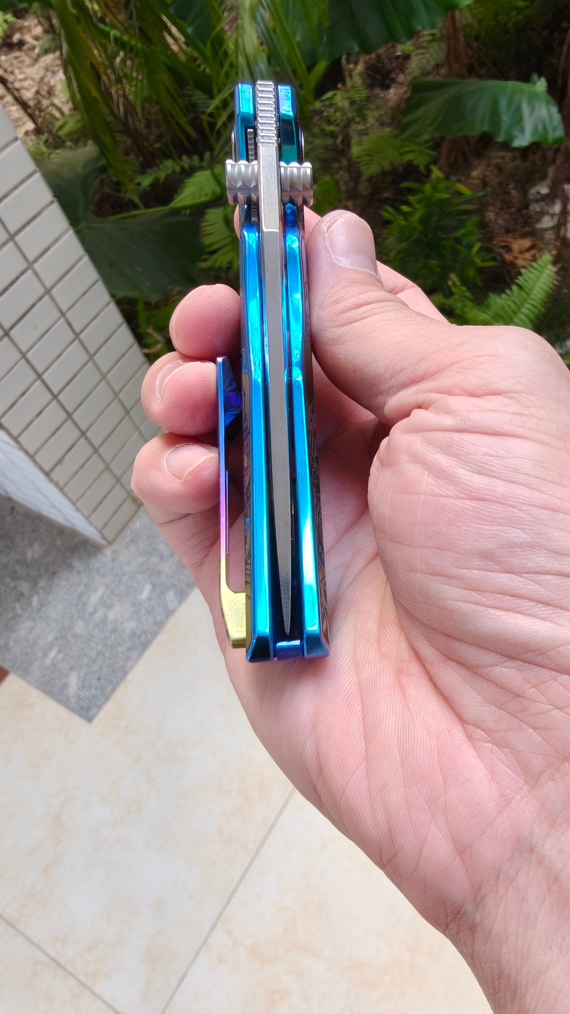 VORIXN "Timeless" Flipper & Thumb Stud Knife Titanium-Engraved Anodized Coloring Handle (3.7" Damascus Blade) KB034